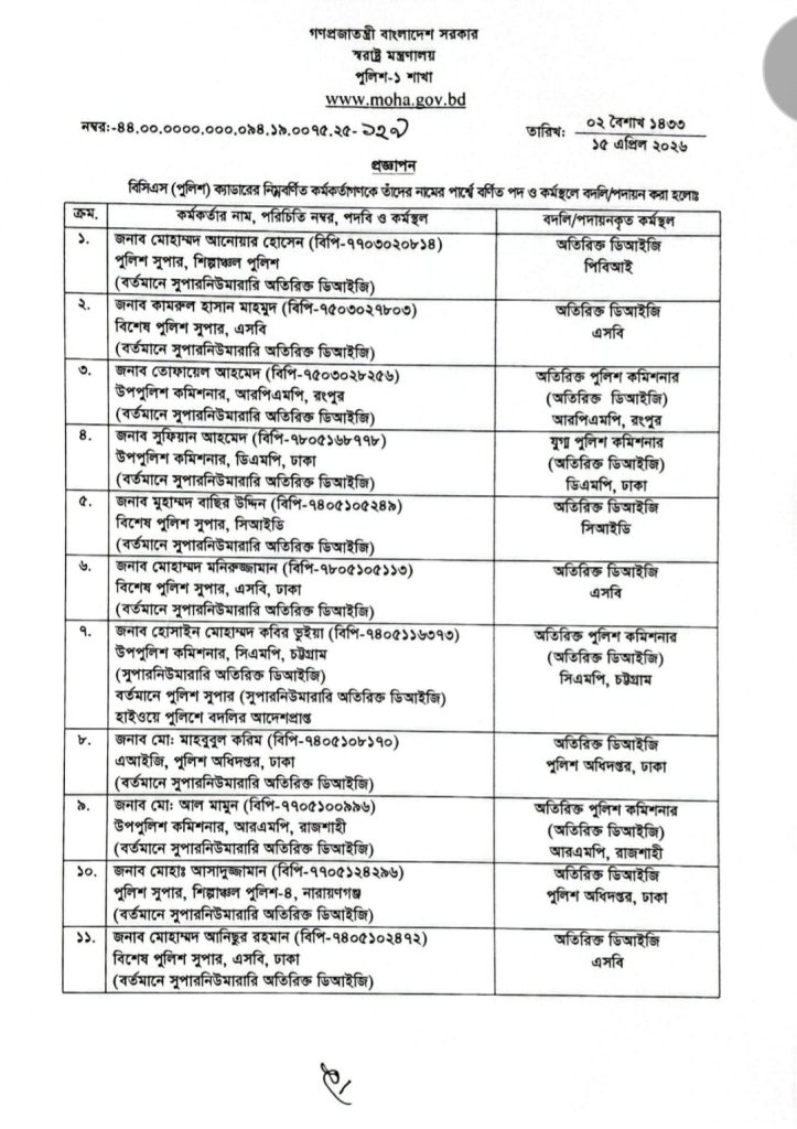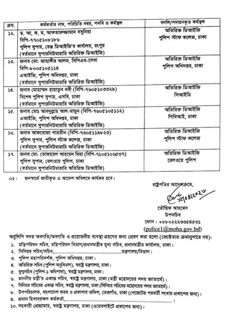 পুলিশের অতিরিক্ত ডিআইজি পদমর্যাদার ১৭ কর্মকর্তাকে বদলি করে নতুন দায়িত্ব দেওয়া হয়েছে।